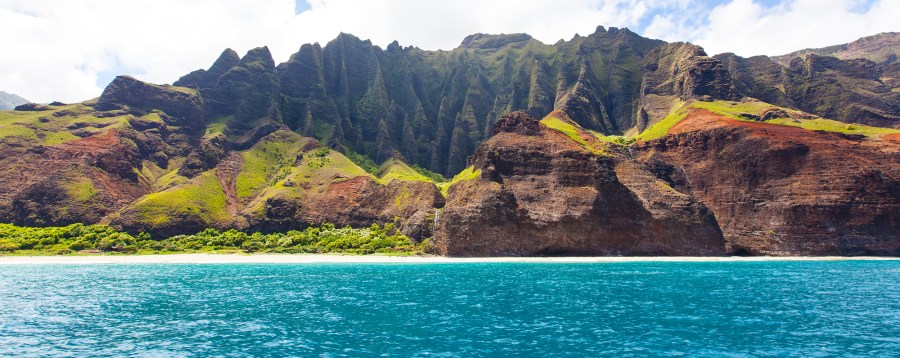 panorama of dramatic cliffs at na pali coast at kauai, hawaii, view from water